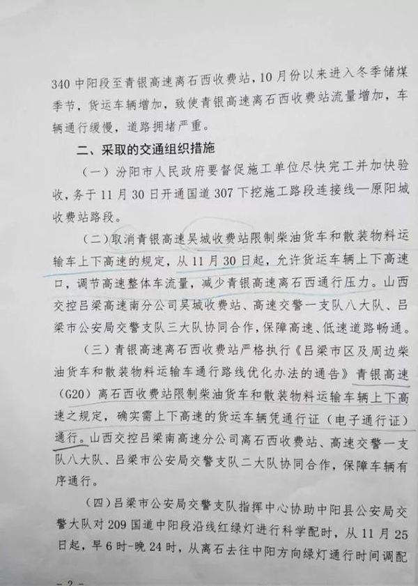 1、取消青银高速吴城收费站限制柴油货车和散装物料运输车上下高速的规定,从11月30日起,允许货运车辆上下高速口,调节高速整体车流量,减少青银高速离石西通行压力。
