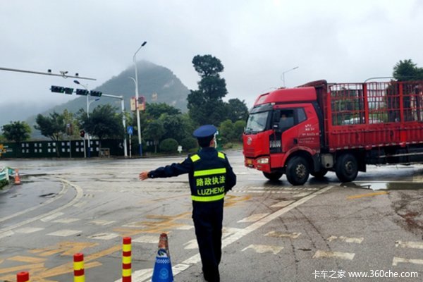 在黄果树收费站引导车辆进入治超通道,镇宁路政执法大队安排部署路政员并向司乘人员宣传治超政策。