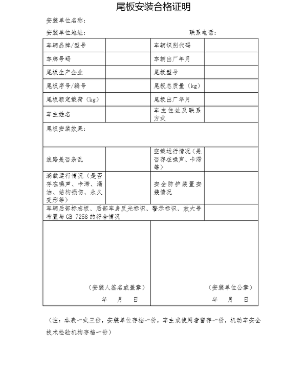 尾板安装企业要按照《车用起重尾板安装与使用技术要求》(GB/T 37706)以及相应的标准检测要求,核验尾板加装检验对应的检测项目,并由安装企业出具尾板安装合格证明(见附件),相关检验过程图像的保存周期不小于6个月。安装的尾板收起状态的水平长度不超过300mm。
