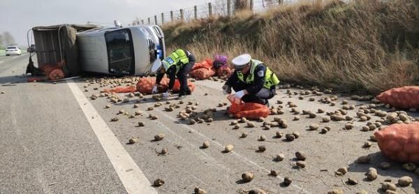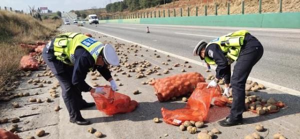 到达现场后,民警发现一辆小货车侧翻在应急车道内,车上装满的土豆滚落于路面,部分已经被压成“土豆泥”,所幸并无人员受伤,适逢春运,辖区管控路段车流量较大,稍有不慎极易引发二次事故。为尽快恢复道路畅通,防止发生次生事故,尽量减少当事人财产损失,民警立即投入现场救援,在肇事现场设立警示标志,指挥后方来车按照提示缓慢通行,徒手将未摔坏的土豆拾起,移至路边,最大限度减少驾驶人的损失。