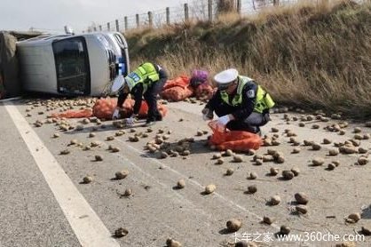 在民警近一个小时的拾起、搬运下,散落的土豆被清理完毕,侧翻车辆被吊起并拖离现场,道路交通秩序恢复正常。