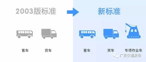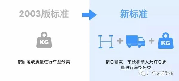 货车由按照额定载质量分类调整为依据车辆总轴数、车长和总质量等进行分类,由原来的5类车型调整为6类。