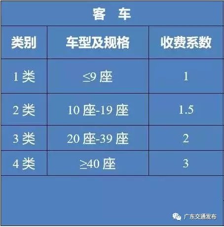 对于40座以上大型客车,广东省现行按照3类客车收费,收费标准降低1/3。为保持公路客运票价稳定,降低社会出行成本,2020年1月1日起,执行新的车型分类方式后,40座以上大型客车仍按照3类客车收费。