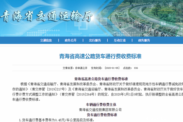 根据《青海省交通运输厅、青海省发展和改革委员会、青海省财政厅关于做好清理规范地方性车辆通行费减免政策工作的通知》(青交养管 [2019]217号)及《青海省交通运输厅、青海省发展和改革委员会、青海省财政厅关于做好货车通行费计费方式调整工作的通知》(青交养管 [2019]264号)的规定,自2020年1月1日0时起,执行新调整的全省高速公路货车通行费收费标准。