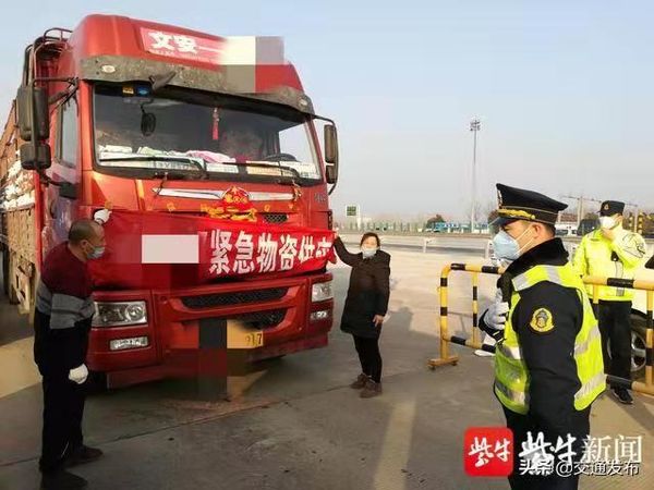 2020年1月31日下午,在G3苏鲁省界入口处,一辆悬挂“紧急物资供应”标志的载货车快速驶入,查控点的工作人员看到救灾物资车辆随即上前对其引导,以保障其可以快速通行。