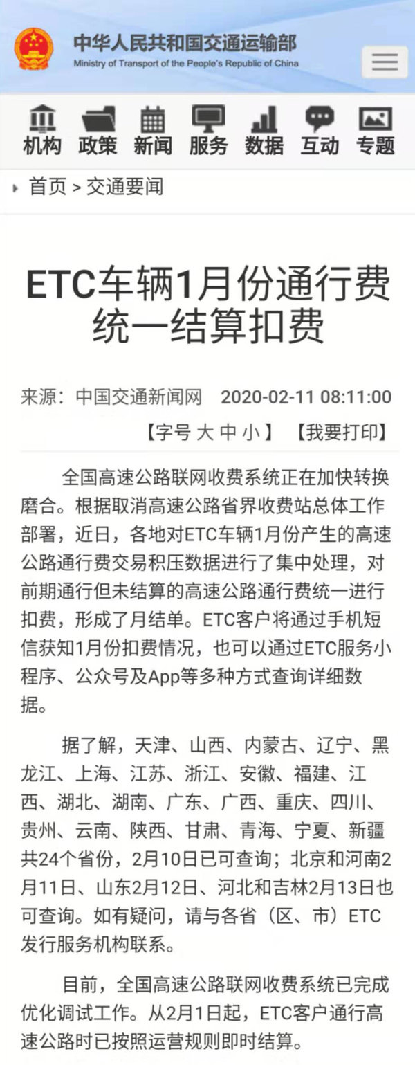 【卡车之家 原创】2020年2月11日,中华人民共和国交通运输部发布了关于《ETC车辆1月份通行费统一结算扣费》的最新消息。消息针对ECT车辆1月份通行费结算扣费的日期进行了详细的说明。