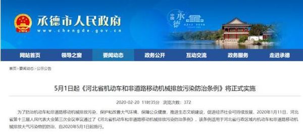 《河北省机动车和非道路移动机械排放污染防治条例》已经审议通过,将于2020年5月1日起施行。