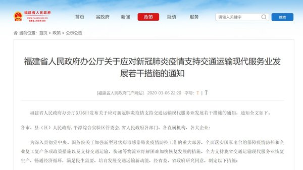 【卡车之家 原创】新型肺炎的爆发,导致全国不少行业受到了巨大损失。为了尽快复工复产,福建省于近期发布了11条具体措施,来全力支持交通运输、快递等物流业恢复生产。