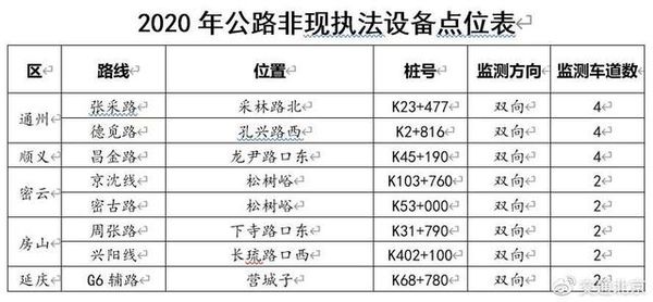 2020年4月6日起,北京市第三批公路货车超限不停车检测执法设备启用,点位附后。