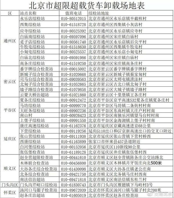 北京市超限超载货车卸载地址及联系电话表已在北京市交通委员会等官方媒体、网站进行公示。