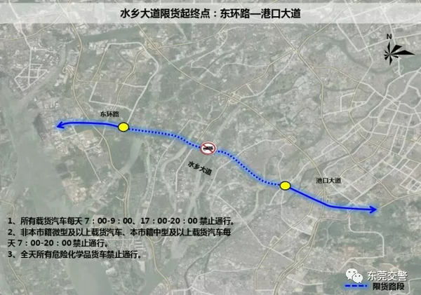 二、水乡大道(东环路—港口大道段)非本市载货汽车、本市籍中型及以上载货汽车每天7:00–20:00 禁止通行。