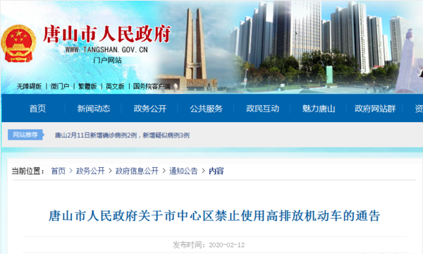 2020年2月14日,唐山市发布《关于市中心区禁止使用高排放机动车的通告》,通告规定了国四及以下排放标准柴油货车的高速、国道和省道绕行区域。