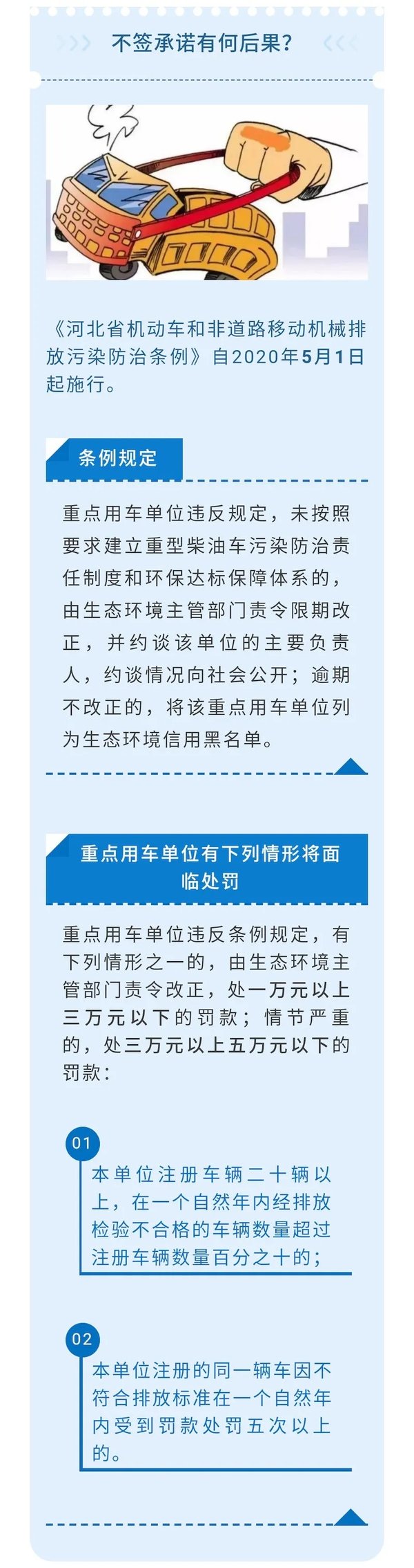 重点用车单位未按照要求建立重型柴油车污染防治责任制度和环保达标保障体系,不签订承诺书的将会受到严厉处罚。