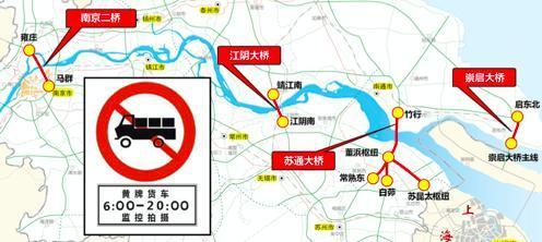 注意:八卦洲大桥(南京二桥)、江阴大桥、苏通大桥、崇启大桥,黄牌货车限时错峰出行,闯禁区货车将罚款100元并扣3分。