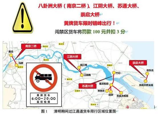 江苏省公安厅交警总队高速支队副支队长孙卫宁介绍,节日期间危险化学品运输车、黄牌货车在八卦洲大桥(南京二桥)、江阴大桥、苏通大桥、崇启大桥限时错峰出行,其中危险化学品运输车全路网、全时段限行,黄牌货车6:00-20:00限行。请部分通行车辆在特定时段尽量“不出行、少出行、错峰出行”。