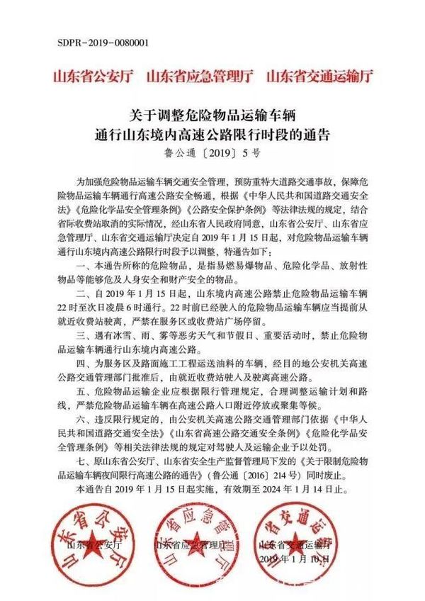 本通告自2019年1月15日起实施,有效期至2024年1月14日止。请广大危险物品运输企业合理调整运输计划和路线。
