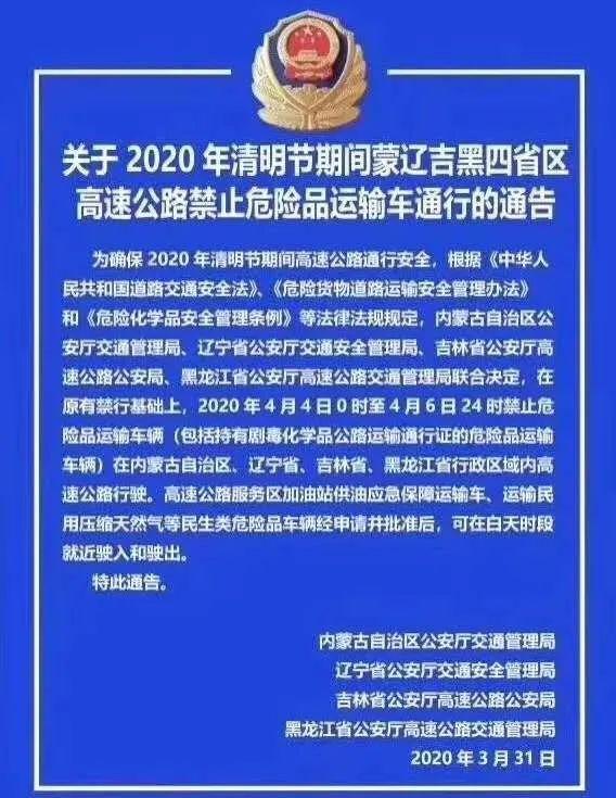 为确保2020年清明节期间高速公路通行安全,根据《中华人民共和国道路交通安全法》、《危险货物道路运输安全管理办法》和《危险化学品安全管理条例》等法律法规规定,内蒙古自治区公安厅交通管理局、辽宁省公安厅交通安全管理局、吉林省公安厅高速公路公安局、黑龙江省公安厅高速公路交通管理局联合决定,在原有禁行基础上,2020年4月4日0时至4月6日24时禁止危险品运输车辆(包括持有剧毒化学品公路运输通行证的危险品运输车辆)在内蒙古自治区、辽宁省、吉林省、黑龙江省行政区域内高速公路行驶。