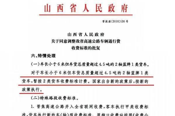 年初,山西省人民政府发布《关于同意调整我省高速公路车辆通行费收费标准的回复》晋政函【2019】126号通知。其中,第六条特情处理指出:“车长小于6米但车货总质量超过4.5吨的2轴蓝牌1类货车,暂按2类货车收费标准计费。国家出台新的政策后,按新的政策执行”。