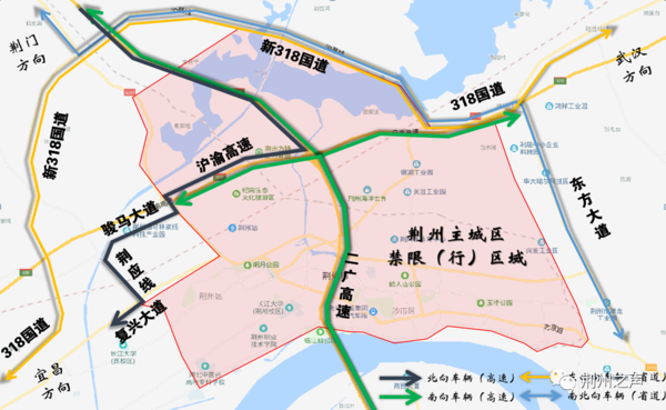 2、核定载质量3.5吨(含)以上的货车可由沪渝高速荆州东收费站、荆州北收费站(往荆门方向)、车马阵收费站下高速,沿东方大道、207国道、新318国道、复兴大道地面层等道路绕行,根据车辆核定载质量按规定的禁限行线路、时间通行;