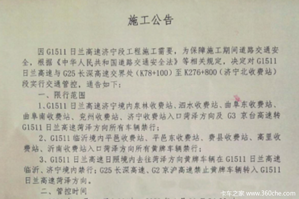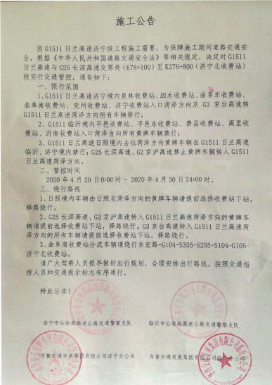 1、G1511日兰高速济宁境内泉林收费站、泗水收费站、曲阜东收费站、曲阜南收费站、兖州收费站、济宁收费站入口菏泽方向及G3京台高速转G1511日兰高速菏泽方向所有车辆禁行;