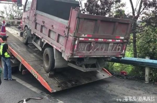 事发后,遵义高速交警二大队民警接到报警迅速赶到现场,几十米的应急车道里洒满了散落的煤炭,本来平直的护栏被撞成了弯弯曲曲的弧形,一辆红色的小货车骑到了护栏上,右前轮脱落。