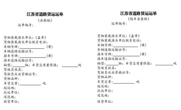 通过公布的货运运单来看,主要有两联:存根联、随车备查联。存根联需要企业存成档案,以备以后核验;随车备查联需要司机随车携带,以便于在路上向交警等执法人员出示。