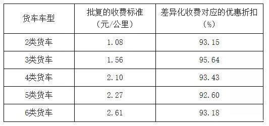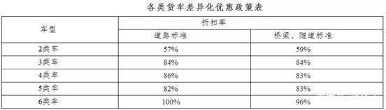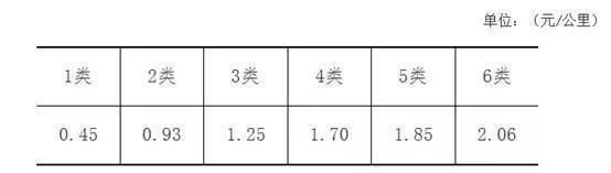 高速公路货车桥隧收费:除了一类(0.5元/车公里)和六类货车(2.91元/车公里)的标准不变外,二类货车由1.57元/车公里调整为1.13元/车公里;三类货车由2.16元/车公里调整为1.86元/车公里;四类货车由2.59元/车公里调整为2.36元/车公里;五类货车由2.81元/车公里调整为2.73元/车公里。