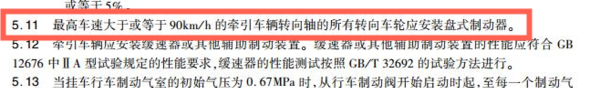 2、最高车速大于或等于90km/h的牵引车辆转向轴的所有转向车轮应安装盘式制动器、危险货物运输半挂车、三轴的栏板式和仓栅式半挂车的所有车轮。