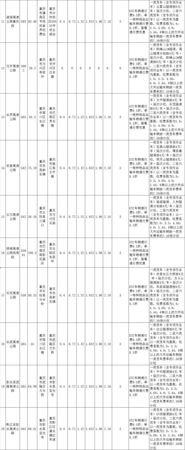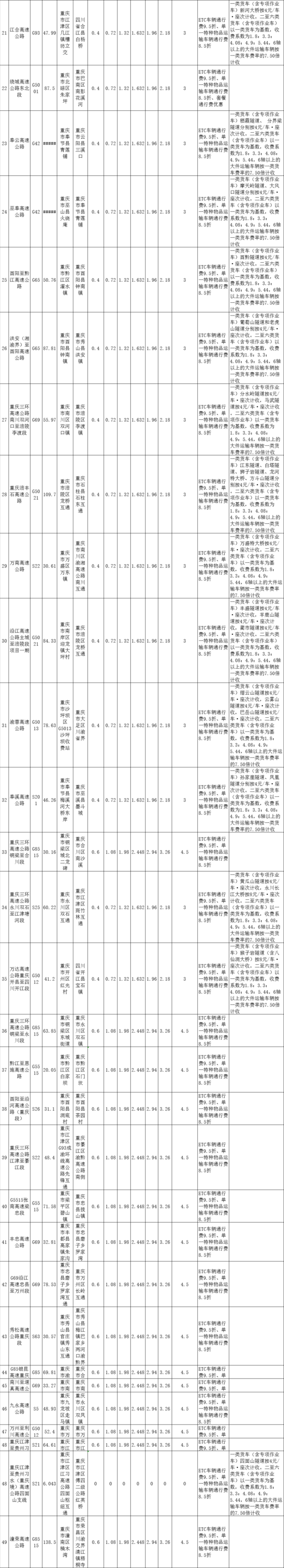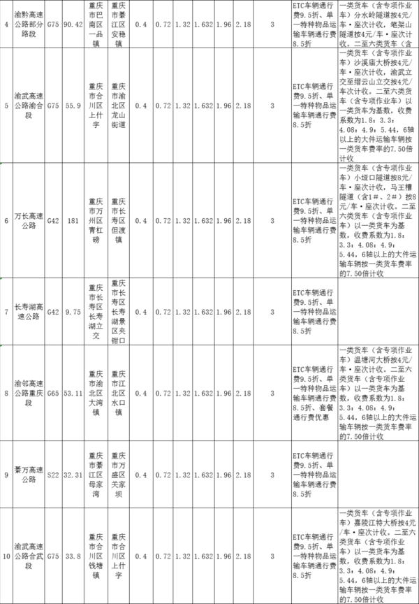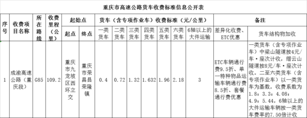 按照交通运输部统一部署,重庆再次调整4型、6型货车收费标准,收费级差系数调整为1.00∶1.80∶3.30∶4.08∶4.9∶5.44。