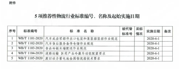 新标准包括:汽车成套零部件出口包装和集装箱装箱作业规、汽车售后服务备件仓储作业规范、食品冷链末端配送作业规范、道路运输 医药产品冷藏车功能配置要求、废旧动力蓄电池金属物流箱技术要求。