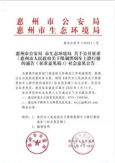 4月14日,广东惠州生态环境局和公安局联合发布征求意见稿,计划今年6月1日对黑烟车实施全天24小时限制通行的交通管制措施。届时,将对违规车辆处以200元记3分的处罚。