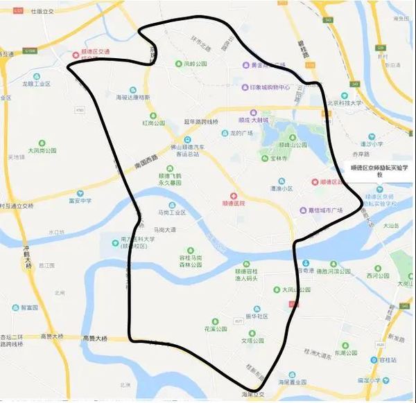(二)顺德区限制通行范围。以碧桂路、德胜路、105国道、红旗路、伦桂路、顺翔路、凤翔路、105国道及桂畔海为边界的闭合区域(不含105国道、碧桂路、德胜路、伦桂路、红旗路)。