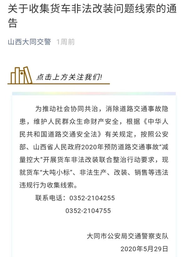 5月29日,大同市交管部门发布《关于收集货车非法改装问题线索的通知》,按照公安部、山西省人民政府2020年预防道路交通事故“减量控大”开展货车非法改装联合整治行动要求,现就货车“大吨小标”、非法生产、改装、销售等违法违规行为收集线索。