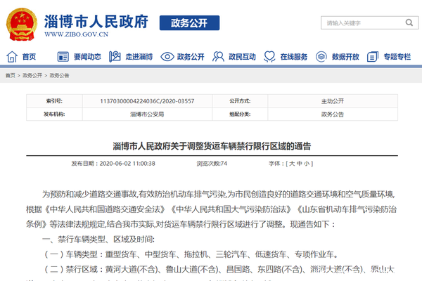 为预防和减少道路交通事故,有效防治机动车排气污染,为市民创造良好的道路交通环境和空气质量环境,根据《中华人民共和国道路交通安全法》《中华人民共和国大气污染防治法》《山东省机动车排气污染防治条例》等法律法规规定,结合淄博市实际,对货运车辆禁行限行区域进行了调整。现通告如下: