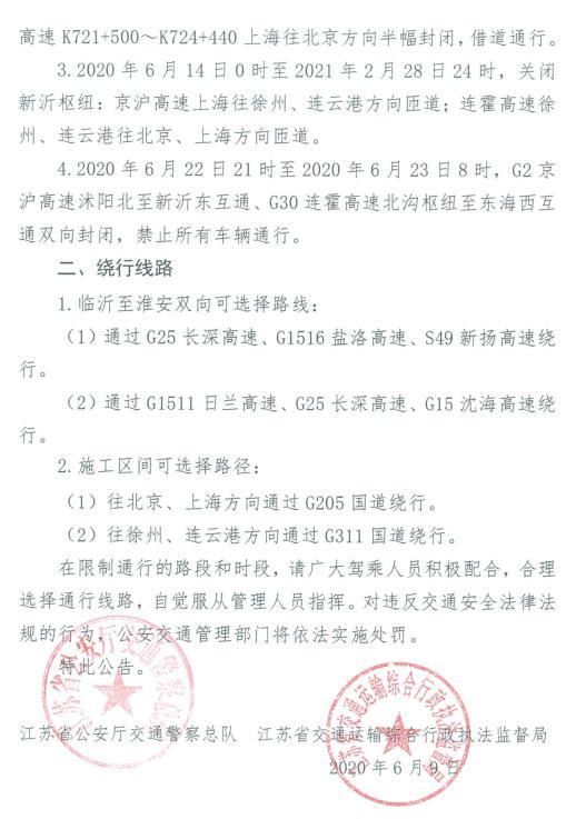 3.2020年6月14日0时至2021年2月28日24时,关闭新沂枢纽:京沪高速上海往徐州、连云港方向匝道;连霍高速徐州、连云港往北京、上海方向匝道。