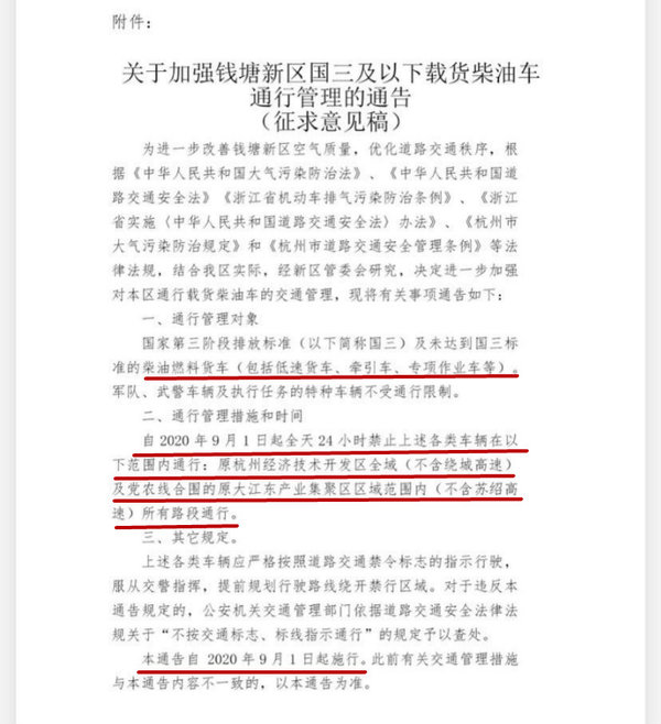 主要内容包括:自2020年9月1日起全天24小时禁止国三及以下车辆在原杭州经济开发区全城(不含绕城高速)及党农线合围的原大江东产业集聚区域范围内(不含苏绍高速)所有路段通行。