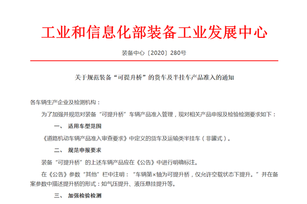 【卡车之家 原创】近日,工业和信息化部装备工业发展中心发布了《关于规范装备“可提升桥”的货车及半挂车产品准入的通知》(简称《通知》),《通知》特别强调了“可提升桥”的申报要求以及检测规范。