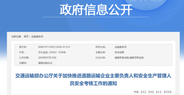 【卡车之家 原创】近日,交通运输部发布通知,要求加快推进道路运输企业主要负责人和安全生产管理人员安全考核工作。