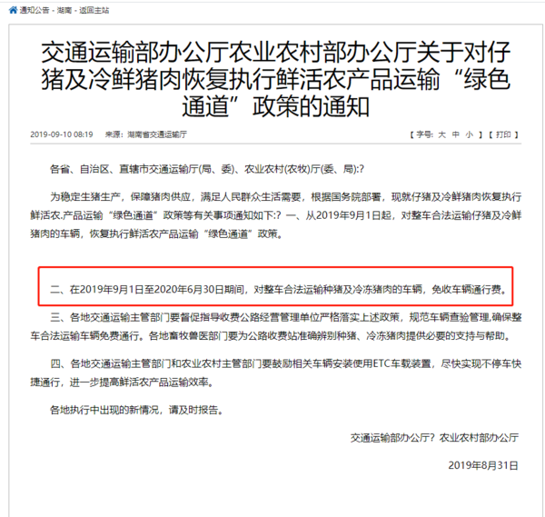 1.从2019年9月1日起,对整车合法运输仔猪及冷鲜猪肉的车辆,恢复执行鲜活农产品运输“绿色通道”政策。