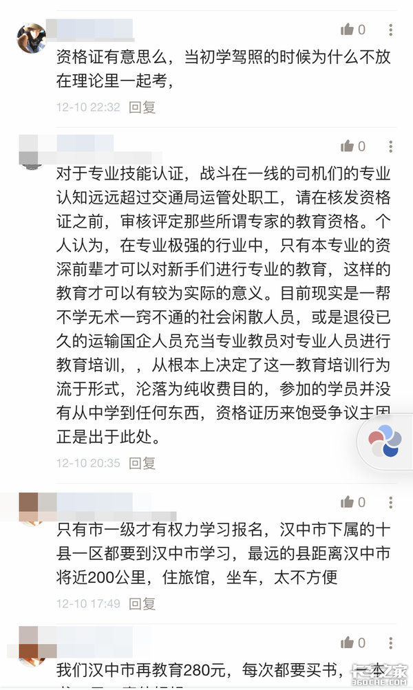 关于从业资格证,笔者与卡友的疑惑,流于形式的考核、疏于监管的制度下的从业资格证与最初提升道路运输安全的初衷是一致吗?从大多数卡友反映的情况来看,或许某些地方的疏于管理,反倒是让从业资格证成为了一些“特殊人群”的敛财工具。
