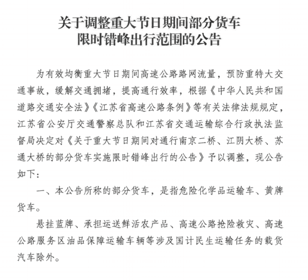 【卡车之家 原创】为有效均衡重大节日期间高速公路路网流量,预防重特大交通事故,缓解交通拥堵,提高通行效率,江苏省公安厅交通警察总队和省交通运输综合行政执法监督局决定对《关于重大节日期间对通行南京二桥、江阴大桥、苏通大桥的部分货车实施限时错峰出行的公告》予以调整。