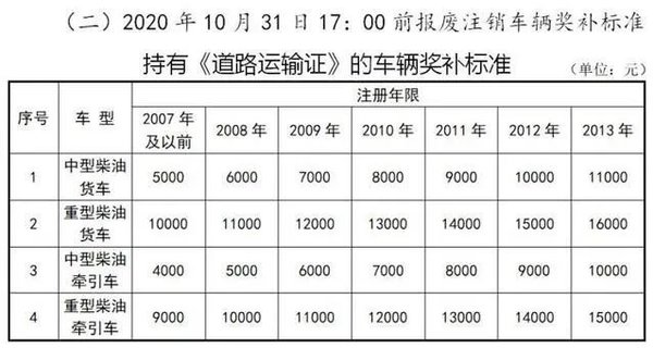并在通告中表示:请国三及以下车辆所有人于2020年10月30日前持本人身份证、企业营业执照、机动车登记证书和机动车行车证的原件及复印件到交通运输局运输管理站“淘汰国三及以下营运柴油车办公室”办理车辆注销业务,并领取补贴资金。