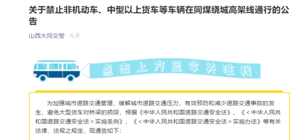 【卡车之家 原创】日前,大同市公安局交通警察支队发布通告表示,禁止中型以上货车等车辆在同煤绕城高架线通行。