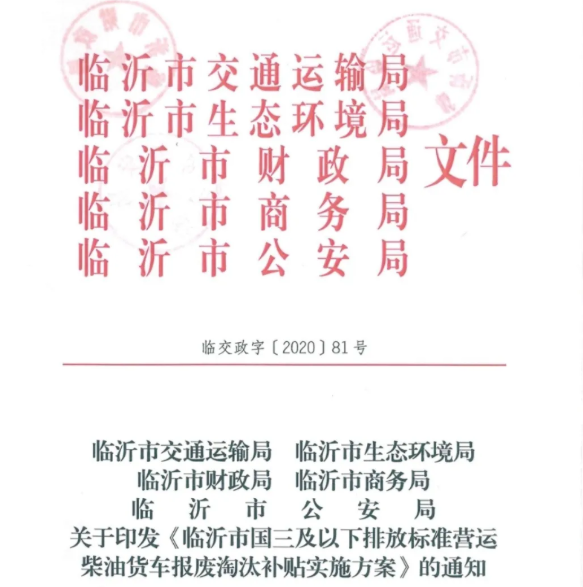 【卡车之家 原创】日前,为加快国三淘汰,山东多地密集出台了有关国三的补贴政策,包括山东潍坊、德州、日照、聊城、淄博。(详情链接:最高可拿4万!山东5市国三补贴方案出炉)而现在,临沂也加快脚步,出台有关国三补贴方案。