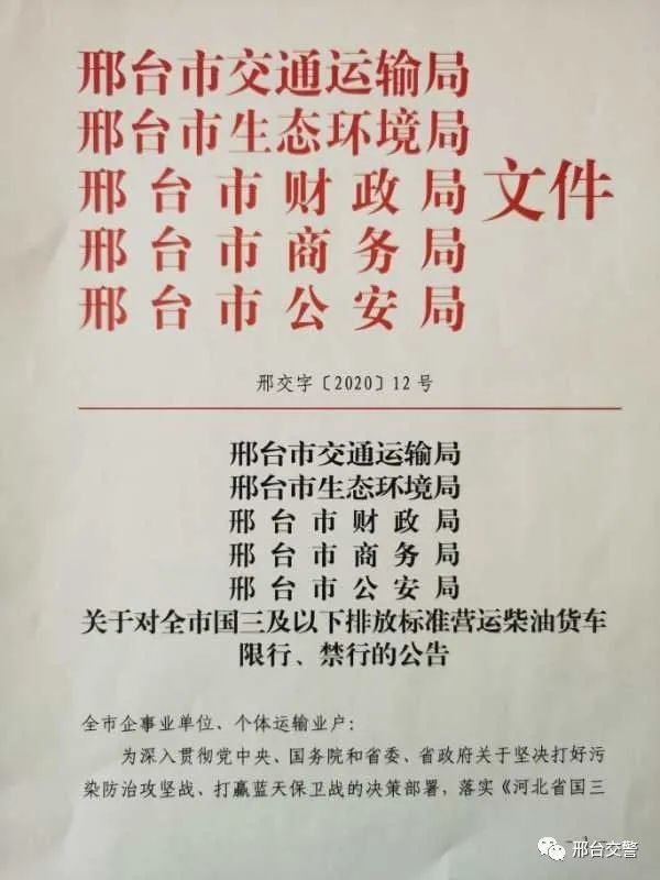 【卡车之家 原创】近日,河北邢台市交通运输局、邢台市生态环境局、邢台市财政局、邢台市商务局、邢台市公安局发布关于对全市国三及以下排放标准营运柴油货车限行、禁行的公告。
