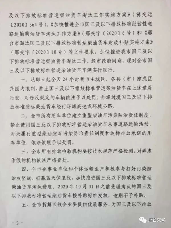 以上两个通知的发布,一方面表示邢台国三淘汰进入到最后阶段,另一方面也意味着再不淘汰国三车,相关车主不但后面没有补贴了,还将不能上路跑运输。请大家根据自己的实际情况,选择适合自己的解决方案。(文/高李敏 信源/邢台交警)