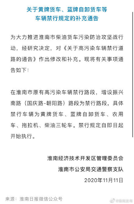 淮南市原有高污染车辆禁行路段,增设振兴南路(国庆路-朝阳路)路段为禁行路段,具体禁行车辆为黄牌货车、蓝牌自卸货车、农用车、拖拉机、柴油三轮车。