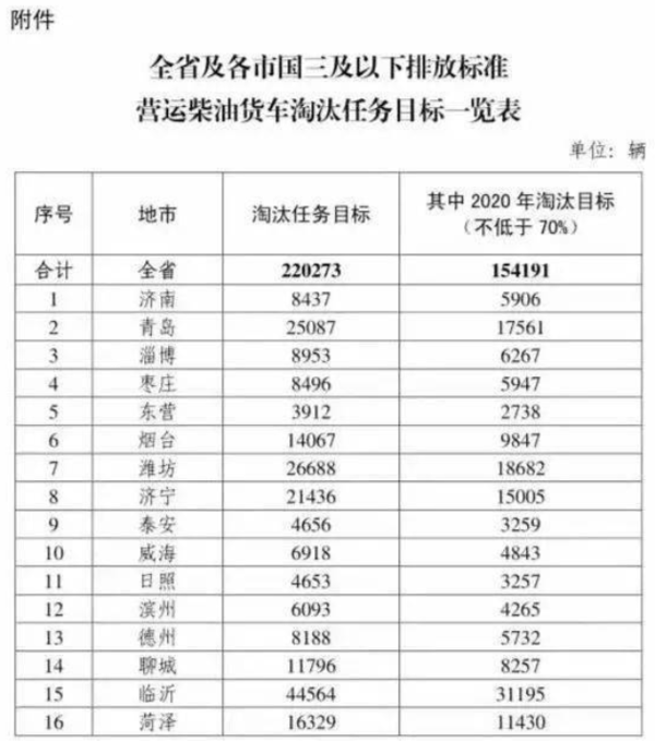 【卡车之家 原创】从山东省财政厅获悉,2020年山东省国三淘汰目标为15.4万辆,目前全省累计淘汰车辆6.3万辆,距离目标还差9万多辆。临近年底,为了完成淘汰任务,省内各市相继出台实施方案。