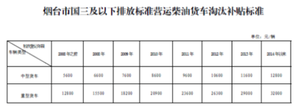 2008年前至2013年低的国三标准营运柴油货车,今年主动淘汰的将分别给予0.4万元至1.6万元不等的补贴。