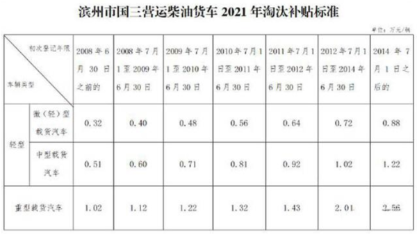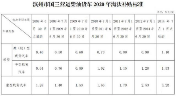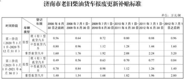 2020年1月1日至12月31日期间提前报废的国三标准重型营运柴油货车按照生产年限不同补贴1.6万至4万元,中型营运柴油货车补贴0.8万至1.92万元,微型营运柴油货车补贴0.5万至1.2万元;